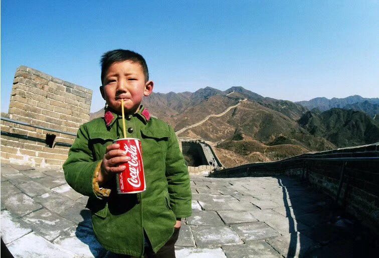 One piece of evidence supporting this hypothesis is the symbolism captured in the photograph “First Coke in Red China” (March 30, 1979), taken by American photographer James Andanson. Staged on the Great Wall in Beijing, the image depicts a Chinese boy drinking Coca-Cola, an iconic American brand, as China began to open its doors to global capitalism. This carefully orchestrated scene condenses the symbolic logic of postmodernity: history and ideology flattened into spectacle, the Great Wall transformed from a monument of sovereign isolation into the backdrop for consumer integration. Here, the East does not merely encounter the West; it completes its circuit. Coca-Cola, once a sign of American cultural hegemony, becomes a floating signifier in a world where ideology circulates without a centre. This dramatic scene, exemplified by Slavoj Žižek’s emblematic invocation of Coca-Cola, would come to shape the cultural and theoretical landscape of the 1990s. In this image, postmodernity reveals itself not as rupture, but as seamless absorption of contradiction into the global flow of signs.
